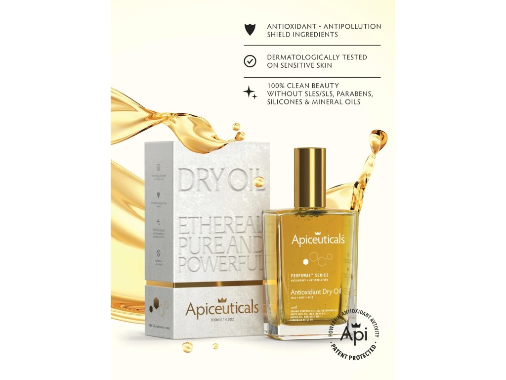 PROPOWAX™ Antyoksydacyjny suchy olejek to wielofunkcyjny eliksir do twarzy, ciała i włosów. Luksusowa mieszanka 7 cennych olejów zapewnia silną ochronę antyoksydacyjną, jednocześnie przywracając miękkość i blask. Naprawdę „suchy”, wchłania się w ciągu kilku sekund i odżywia głęboko, nie pozostawiając żadnej tłustej warstwy. Skóra staje się jedwabista, sprężysta i otulona w ultra-luksusowy zapach „Woods of Arcadia” od Apiceuticals.