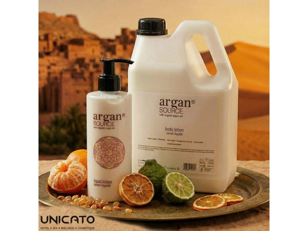 Kosmetyki hotelowe ARGAN SOURCE, które zawierają organiczny olej arganowy. Eliksir upiększający, który dzięki swoim przeciwutleniaczom stał się obowiązkowym elementem produktów kosmetycznych. Ma także działanie zmiękczające i nawilżające. Czarujący zapach i elegancki, satynowy design przeniosą Twoich gości w klimat Maroka. Wyrafinowana jakość inspirowana złotem pustyni.