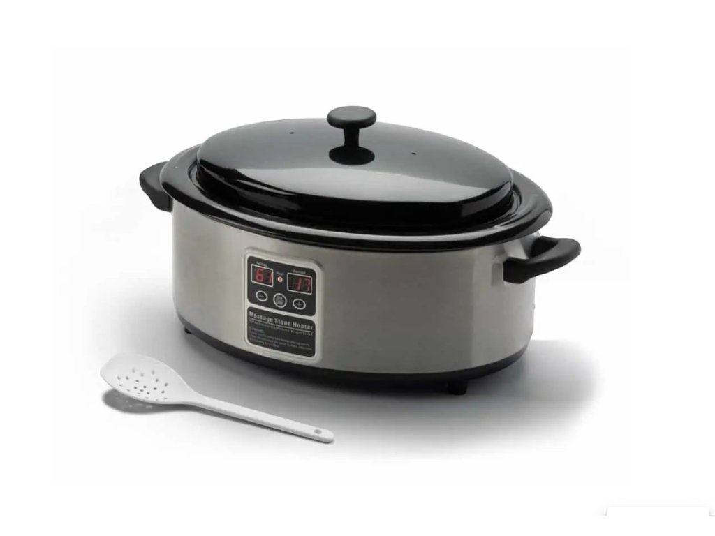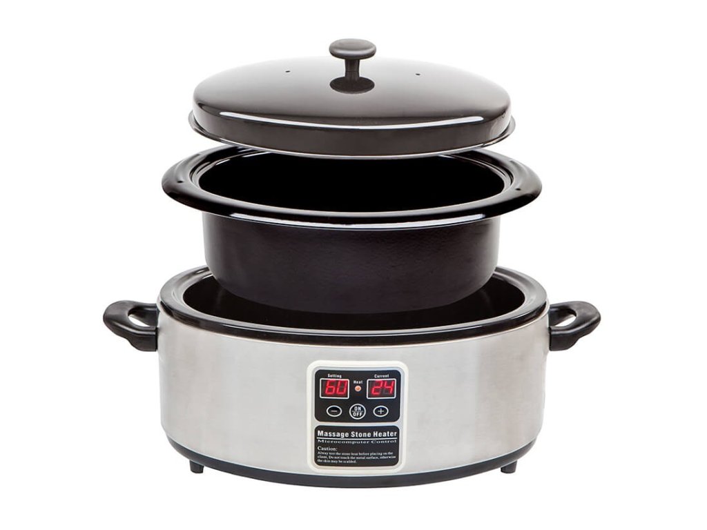 Podgrzewacz kamieni lawowych składa się z trzech części: zewnętrznej części ze stali nierdzewnej, na której znajduje się cyfrowy wyświetlacz, wyjmowanej tacki o pojemności 6 litrów oraz żaroodpornej pokrywy. Pojemnik wykonany jest ze stali nierdzewnej i solidnego tworzywa sztucznego. Zaletą podgrzewacza z cyfrowym wyświetlaczem jest prosta i szybka obsługa. Pojemnik wyposażony jest w funkcję wstępnego podgrzewania kamieni lawowych. Pojemność 6 litrów zapewni Ci wystarczająco dużo miejsca, aby podgrzać cały zestaw.