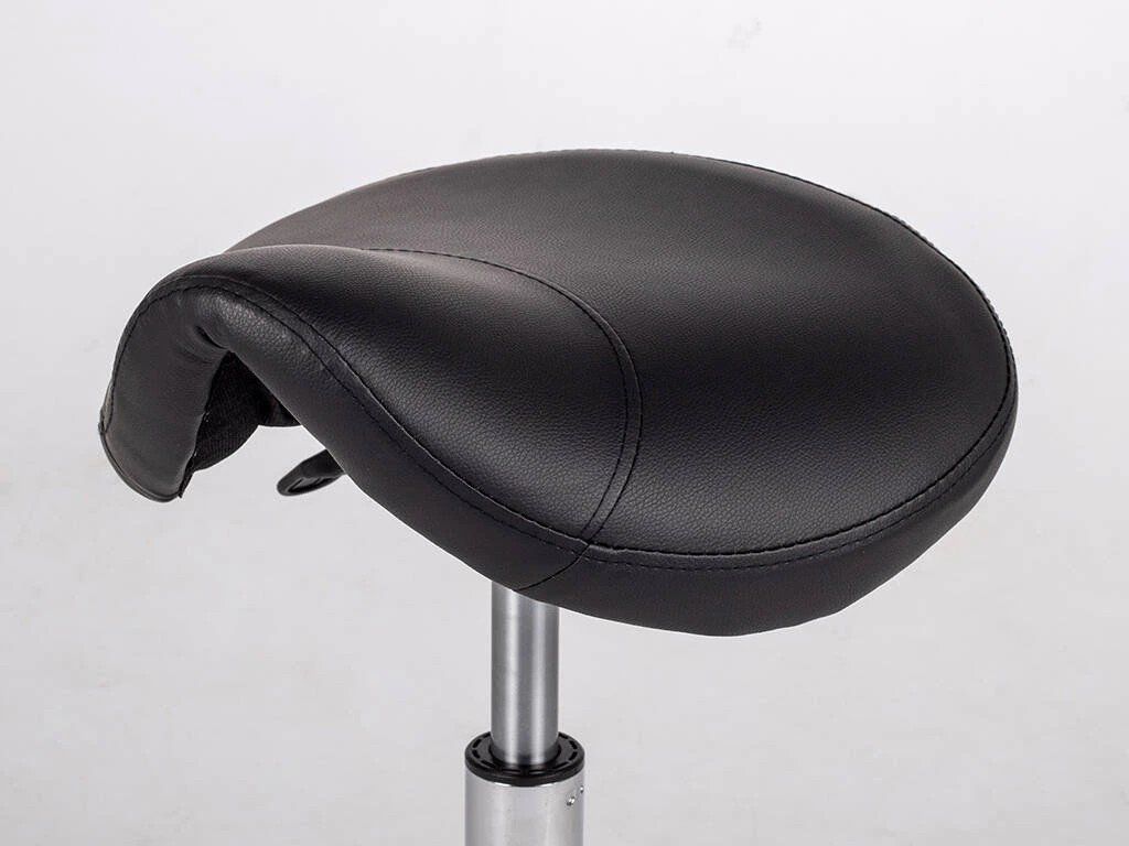 Ergonomiczny fotel obrotowy z wyprofilowanym siedziskiem w kształcie siodła, wygodną regulacją wysokości za pomocą sprężyny gazowej i kółek. Fotel siodłowy zapewnia optymalne rozłożenie ciężaru ciała i ułatwia przyjęcie naturalnej pozycji siedzącej. Pięcioramienna, lśniąca, chromowana podstawa doda elegancji każdemu wnętrzu. Zaprojektowany do salonów masażu, fizjoterapii, salonów kosmetycznych i fryzjerskich.