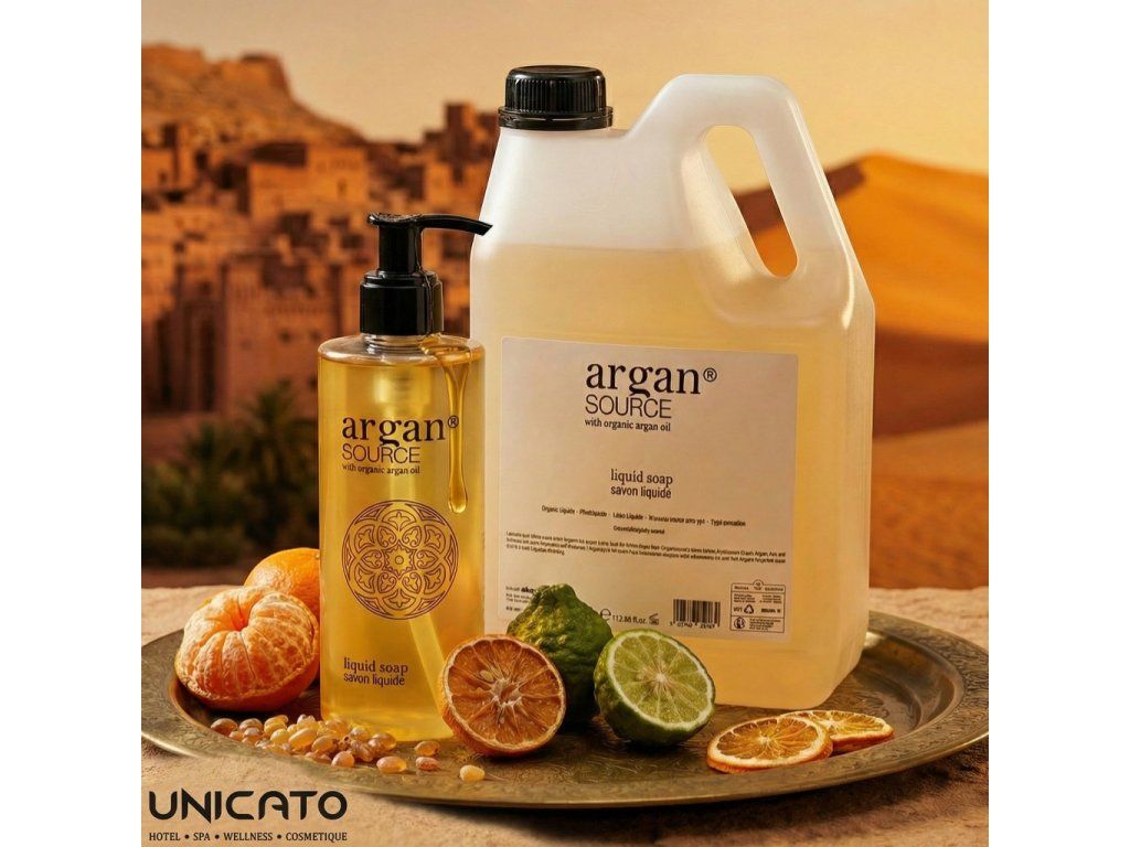 Kosmetyki hotelowe ARGAN SOURCE, które zawierają organiczny olej arganowy. Eliksir upiększający, który dzięki swoim przeciwutleniaczom stał się obowiązkowym elementem produktów kosmetycznych. Ma także działanie zmiękczające i nawilżające. Czarujący zapach i elegancki, satynowy design przeniosą Twoich gości w klimat Maroka. Wyrafinowana jakość inspirowana złotem pustyni.