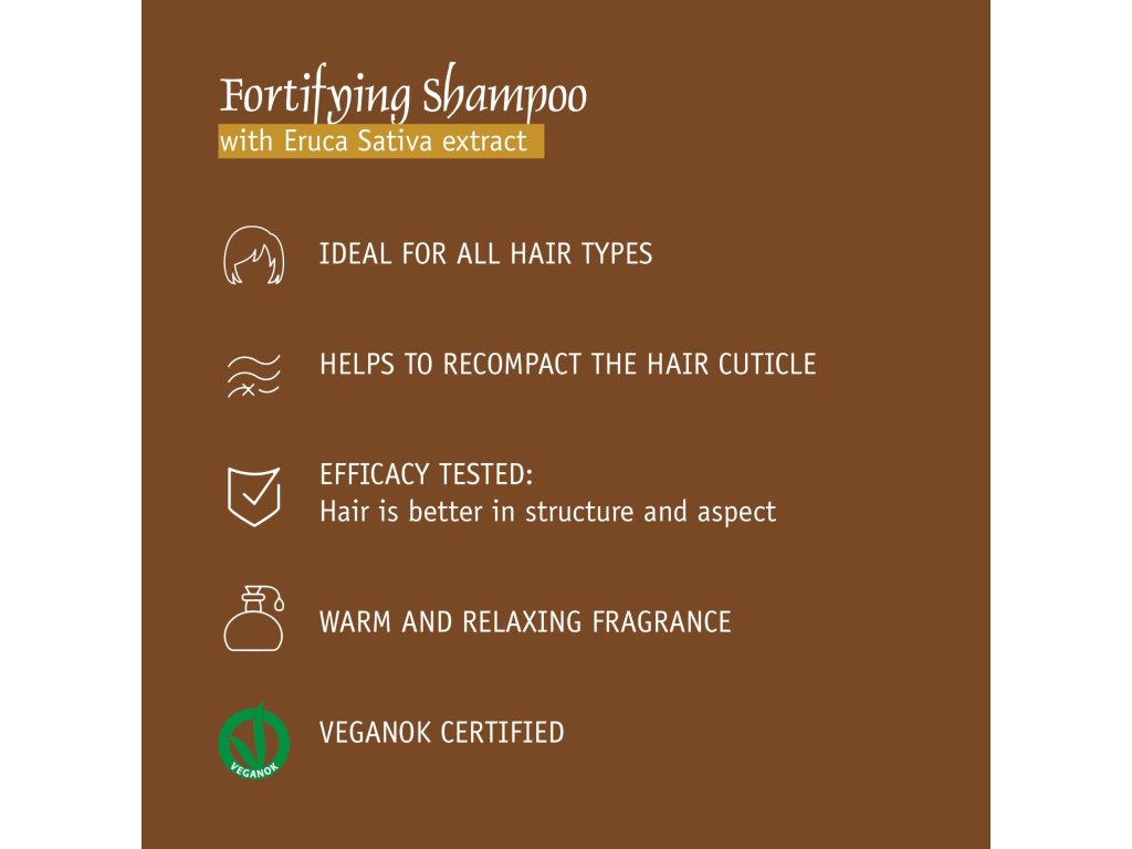 Szampon wzmacniający z ekstraktem z rukoli (Eruca sativa) Delikatnie oczyszcza włosy i zagęszcza strukturę włosa, dzięki czemu wzmacnia się jego blask.
