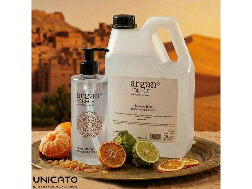Kosmetyki hotelowe ARGAN SOURCE, które zawierają organiczny olejek arganowy. Eliksir piękna, który stał się niezbędnym kosmetykiem dzięki zawartości przeciwutleniaczy. Posiada również właściwości zmiękczające i nawilżające. Zachwycający zapach i elegancki satynowy design przeniosą Twoich gości do atmosfery Maroka. Wyrafinowana jakość inspirowana złotem pustyni.