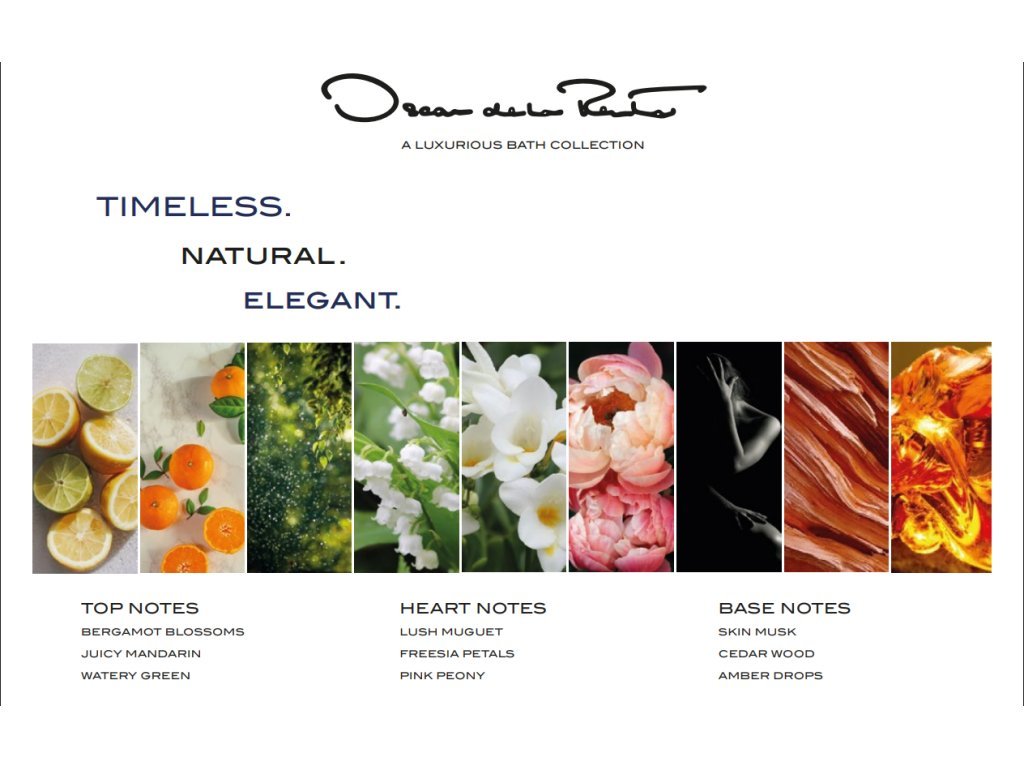 Ekskluzywna kolekcja zapachów Oscara de la Renty ucieleśnia istotę elegancji i luksusu. Zainspirowane jego dziedzictwem doskonałości, te kreacje łączą w sobie najszlachetniejsze składniki, aby emanować wyrafinowaniem i radością. Idealnie nadają się do hoteli, które chcą zaoferować wyjątkowe doznania sensoryczne.