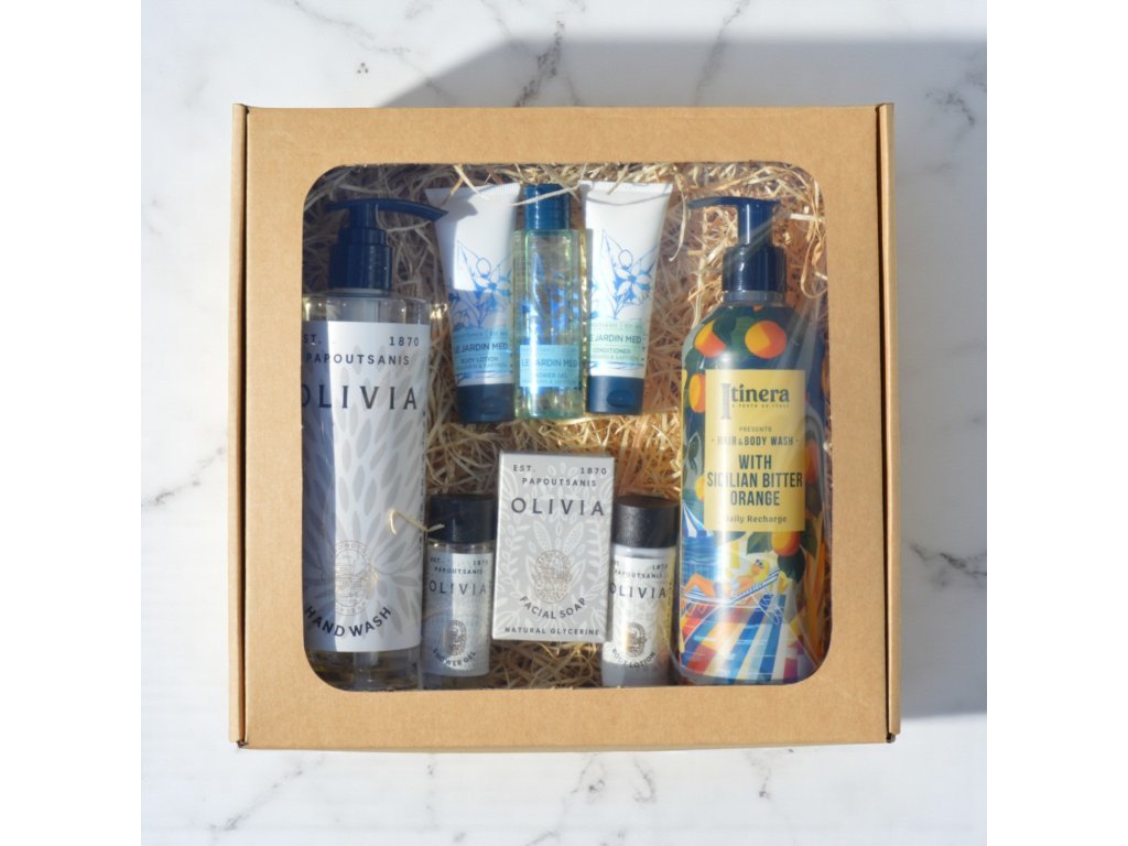 Oferujemy idealny wybór naszych kosmetyków – ZESTAW UPOMINKOWY ŚRÓDZIEMNOMORSKI. W pudełku z przezroczystym wieczkiem, starannie wyselekcjonowane linie kosmetyków naszych marek, umieszczone są na drewnianej desce. To mała degustacja, która przeniesie Cię w śródziemnomorski klimat, gdzie oczarują Cię zapachy gajów oliwnych, cytrusów i morskiej bryzy. Sprawi, że prezent będzie niezapomnianym przeżyciem. Zestaw zawiera kosmetyki z linii ITINERA, OLIVIA, LE JARDIN MED.